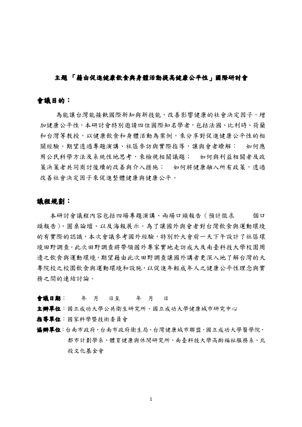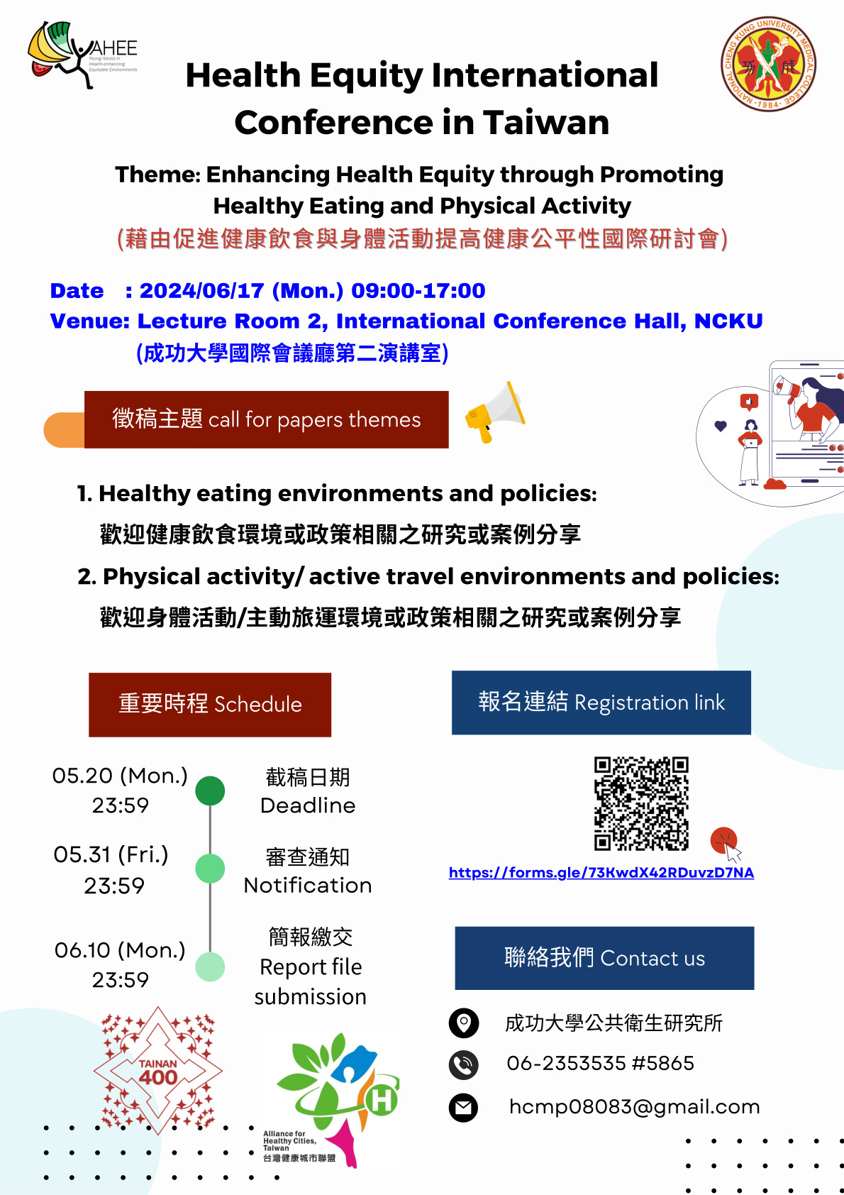 The seminar agenda includes four keynote speeches, two oral report sessions (8-12 presentations are expected), a roundtable forum, and poster displays. To give international participants a practical understanding of Taiwan's diet and exercise environment, a community field survey is scheduled for the afternoon before the conference, based on foreign experiences. This field survey will guide international experts on a visit to the dietary and exercise environments around the campuses of National Cheng Kung University and Southern Taiwan University of Science and Technology. The aim is to provide international speakers with a deeper understanding of the campus diet and exercise environments and facilities at Taiwanese universities, fostering discussions on connecting the concepts and practices of health equity for young adults.