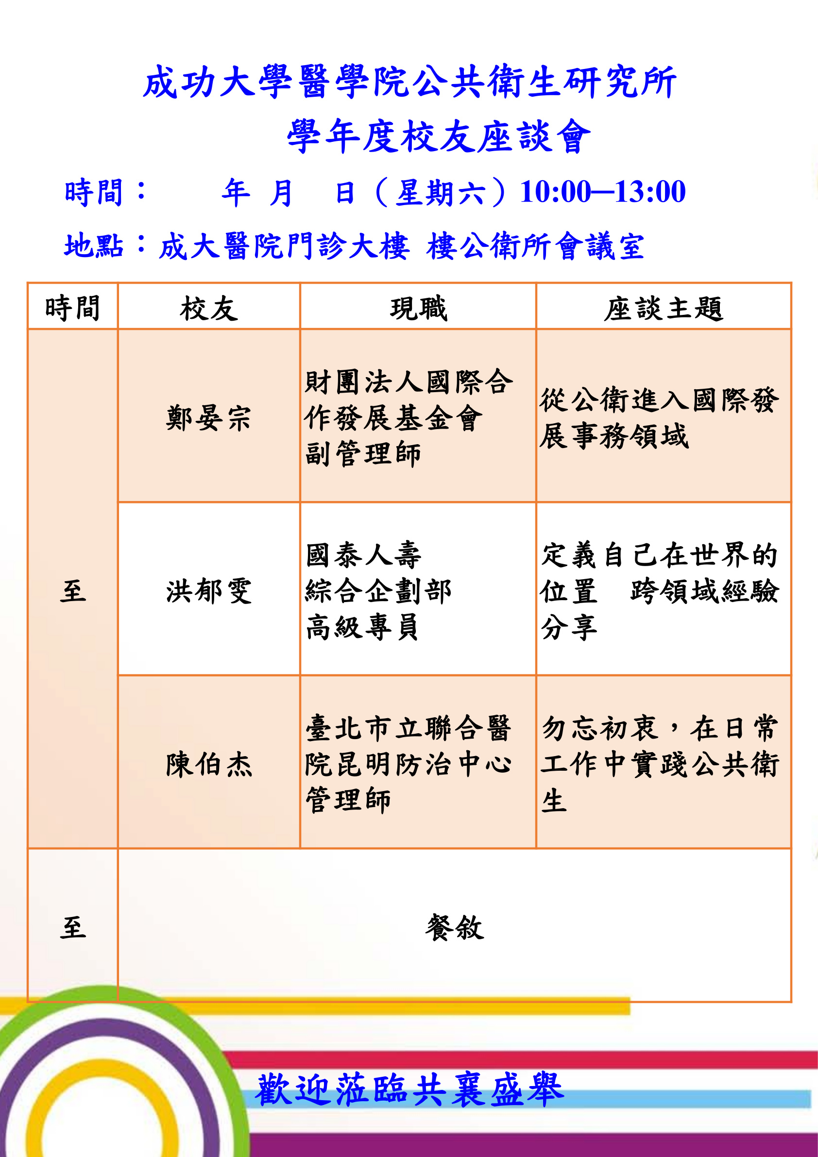 Time | Alumni | Current Position | Discussion Topic |